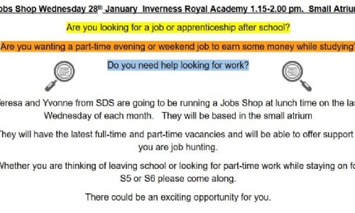 Published 26/01/26Jobs Shop Wednesday 28th January Inverness Royal Academy 1.15-2.00 pm. Small Atrium.